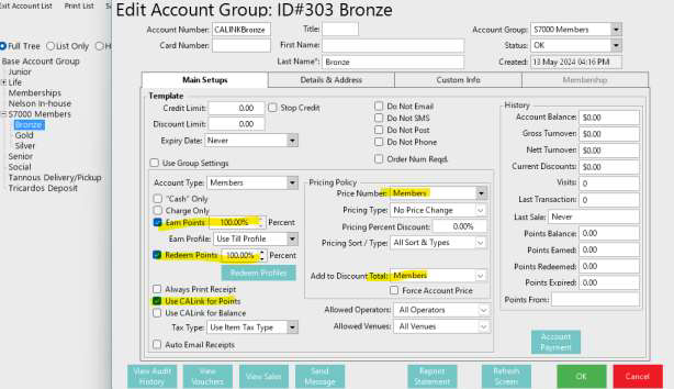 With Update Bepoz Account on [venue setting] the accounts will be pulled from S7000 [API call] into Bepoz and created or updated in the correct Account Group with Correct Settings and Group settings applied.