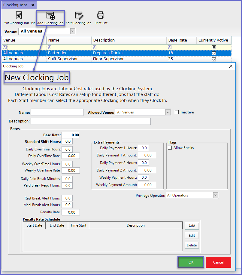 - Once all Information has been input into the desired fields, click OK to save and the Clocking Job will then be updated