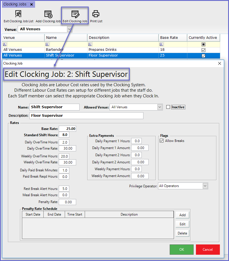 - From here, a new window will appear allowing for editing and making changes accordingly for the respective Clocking Job