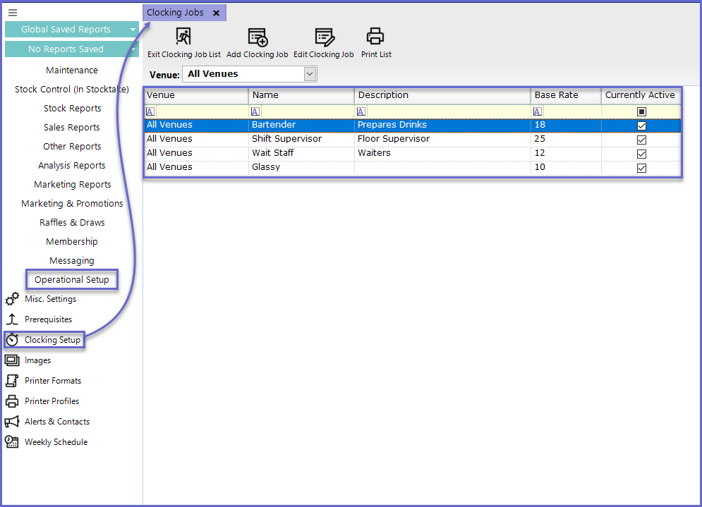 This article covers an overview of the available Clocking Job Functionalities in BackOffice. Clocking Jobs are the Labor Cost rates used by the Clocking System. There are a number of Jobs and Roles that Staff Members can carry out meaning that different rates can apply when working. Clocking Jobs can be created and applied to Staff Members providing a more efficient way in managing labor costs in relation to the hours worked.