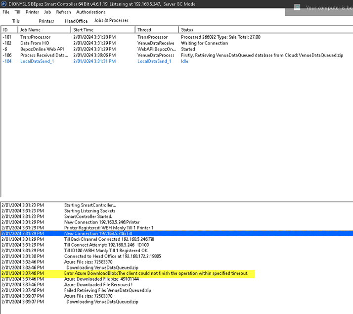 When sending VenueData Cloud databases to remote sites, if the internet is poor or slow and the VenueData.zip file is of largish size, if this takes longer than 5 mins to download at the remote location then Smartcontroller will terminate the connection and timeout.