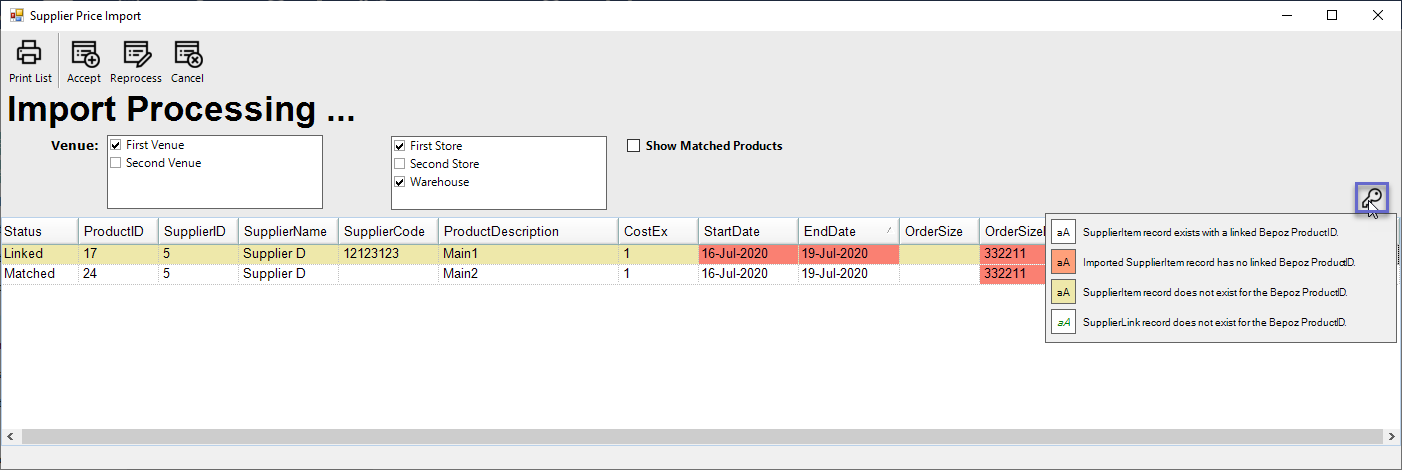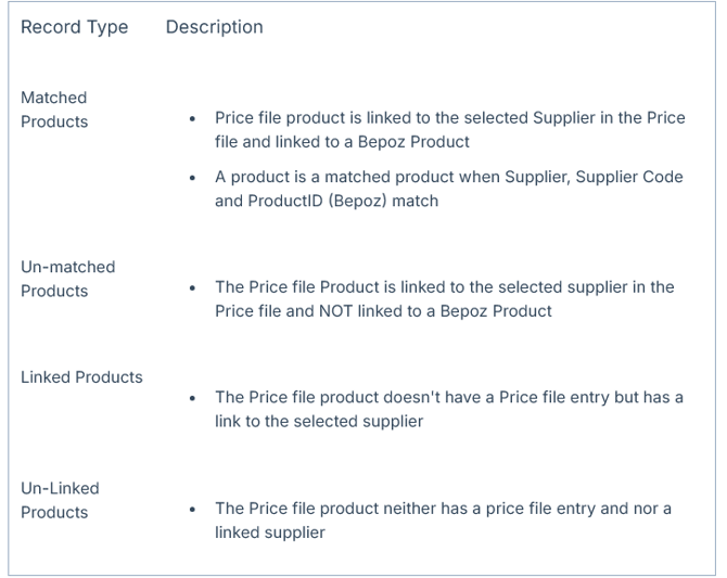 Once its imported and no error messages displayed, the price file record will be categorised into four different categories