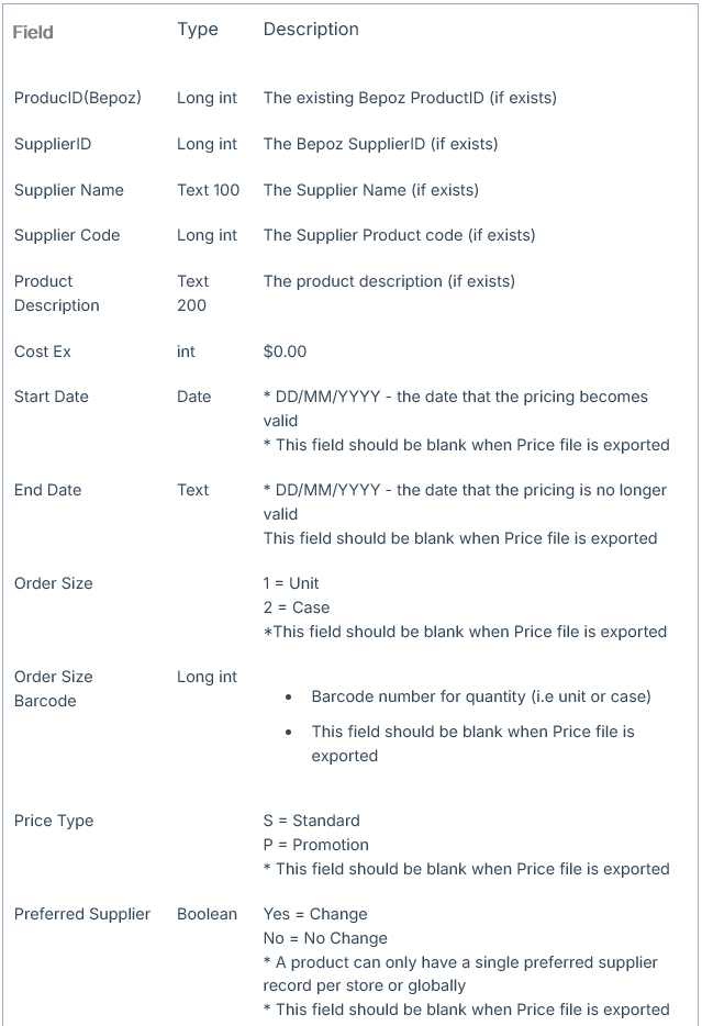 From there you can send the Exported file to your Supplier and they can fill in the File using the File Format above