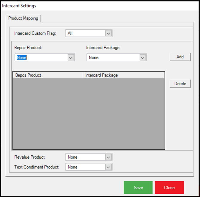 This matrix allows Bepoz products (e.g. "$20 Top Up") to be mapped to Intercard packages. |