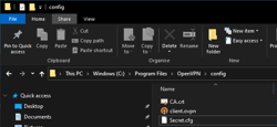 · Copy the CA Certificate + Secret.cfg + client.ovpn files to (C:\\Program Files\\OpenVPN\\config)