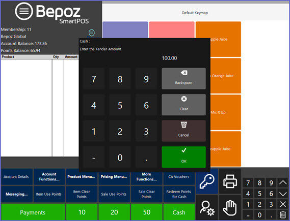 - Select the desired Payment Method, and in the Tender Amount window, use the number pad to enter the Amount to be credited to the Account