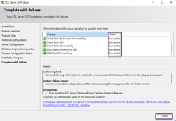 SQL Server should now start the installation process and once finished should show the Complete Window, with a Status for each Feature installed which should all be 'Succeeded', Click Close to Exit the installation Wizard.