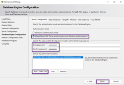 Database Engine Configuration, ensure 'Mixed Mode' is checked and enter a SA (System Administrator) password, Default is normally 'do4safet', also ensure that all Windows Users that require System Admin Rights are specified in the Server Administrators. Click Next to Continue.