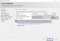 Server Configuration, ensure SQL Server Browser is set to 'Automatic' and Check Grant Perform Volume Maintence. Click Next to Continue.
