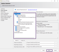 Feature Selection by default is set to the correct features, but the Machine Learning Services are not required so these can be unchecked. Click Next to continue