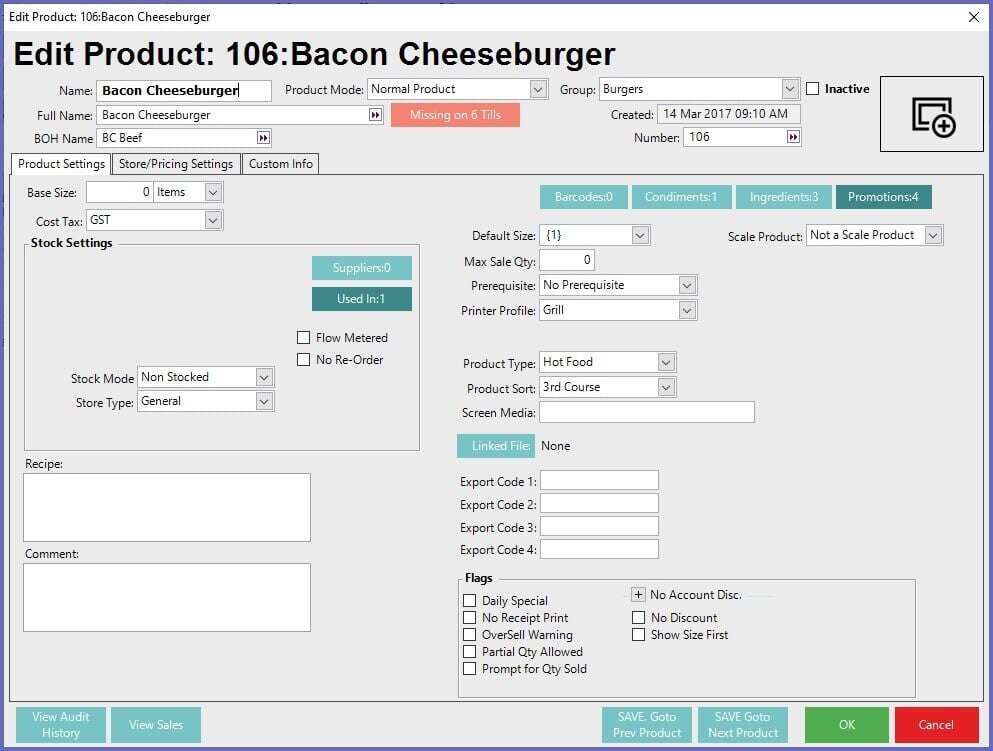 In Bepoz, there are 6 Stock Modes that can be selected when a Product is being created. The Stock Mode selected may determine whether other settings are applicable for the Product and whether or not certain data is recorded.