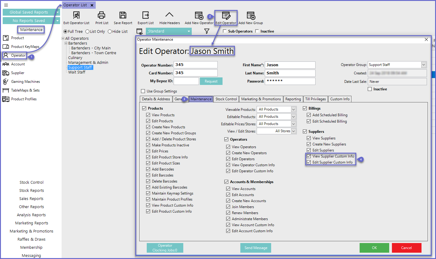 - Within Operator Maintenance , there are a number of privilege flags that need to be enabled for an Operator to access & edit the Custom Info components throughout BackOffice