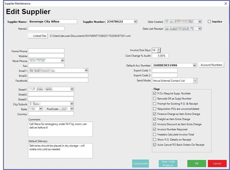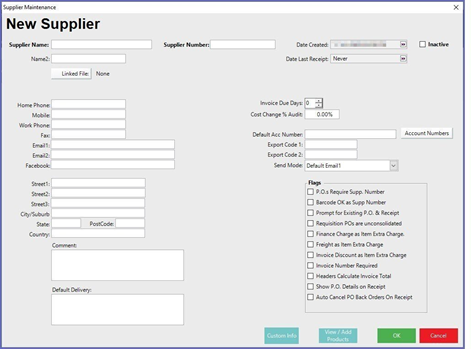 After opening a Supplier Maintenance window, whether to Edit an existing Supplier or to Add a New Supplier, there will be a plethora of fields and configuration options which are detailed in this article.