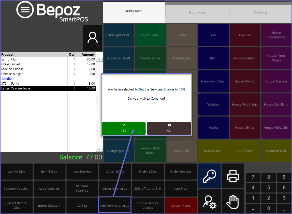 - Prior to being applied, a series of prompts will always display, first asking the Operator if they would like to continue and then advising the Operator that a Service Charge is being set