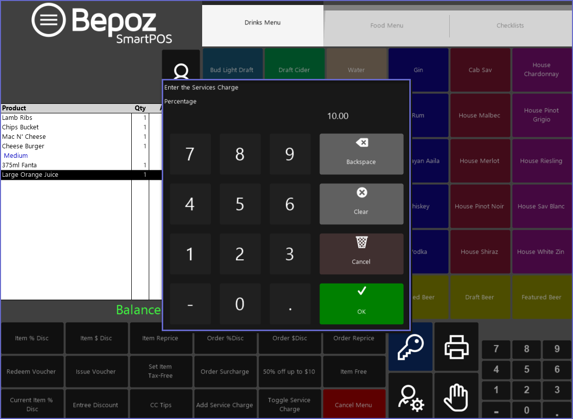 - When an Operator selects a Service Charge Function button, if the Percentage Amount is not Preset, they will be prompted to enter a Percentage Amount