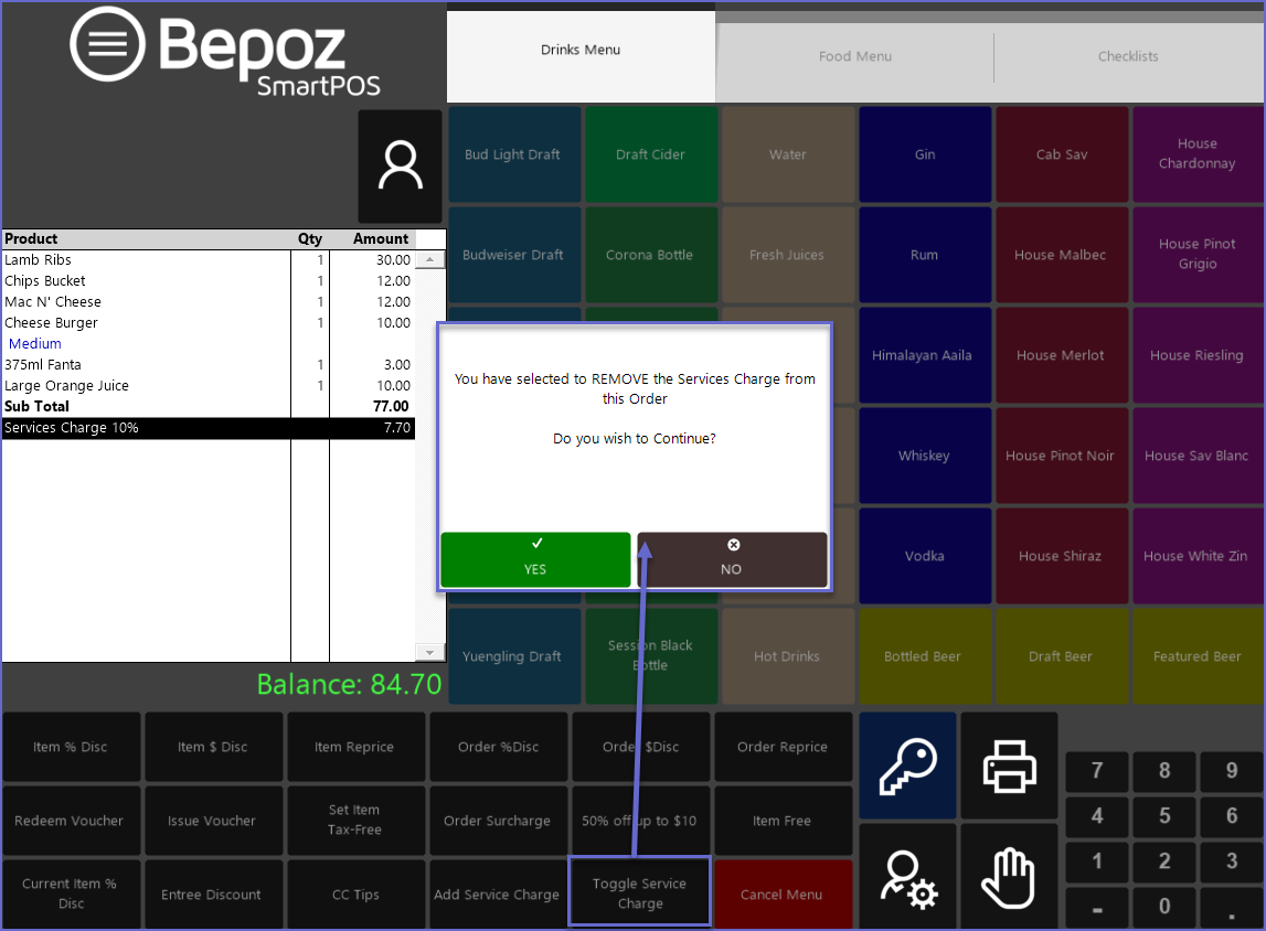 - When an Operator selects the Toggle Service Charge button, a series of prompts will display, first asking the Operator if they would like to continue and then advising the Operator that the Service Charge has been removed