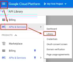 Click the Menu button on top left-hand corner and select “APIs & Services” -> Library and Enable FOUR APIs services: