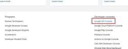 After create new account, it will go to google developer’s account. Scroll down to bottom of developer home page and click “Google API Console” link (red box of below picture.