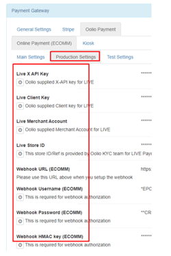 In Production Setting, needs to put these keys and values in YourOrder Production Setting of Oolio Payment section.