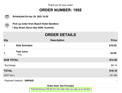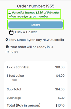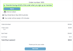 Potential savings will only appear for guests of the venue. When a guest has made an order and a payment, they will be moved to the checkout screen. This window will display the potential savings in green text near the top of the screen and underneath it, there will be a button for customers to sign up as members. This button will only appear if “New Member Sign-Up” is enabled in YourOrder backpanel. The savings can also be seen on the order invoice.