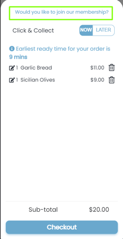 On mobile, there is also an option in the cart list that allows users to sign up as a member. It will display only if the customer is using the guest checkout. At the top of the cart panel the message, “Would you like to join our membership?”, will appear and after a few seconds will be replaced with a