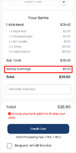 YourOrder Holiday surcharge feature allow businesses to add surcharge % to total invoice at the checkout page.