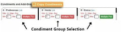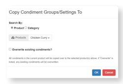 Copy Condiment Group – Allows users to copy condiment(s) and informative settings from one product to a selected Product(s) or category(s). It will copy the condiment group selection and settings to the other products/categories.