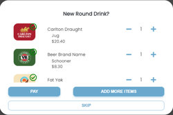 Within the panel, it will display the last order drinks on the top and has items auto-selected by default. The end-user can modify the quantity of the selected products or choose to add more order items. The size and condiments are recorded from the previous order and do not need to be re-selected each time. After quantities are selected, users can pay for these items using the “PAY” button. If round drinks are unwanted, click “SKIP” at the bottom to close the window.