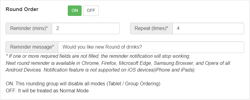 Reminder (mins) and Repeat (times) are used solely for mobile notifications and only accepts a numeral value as input, while the Reminder message is the text that will appear on prompts in the frontend and round drink notifications. If it is left empty the default value, “Would you like to order another round?” will be used.