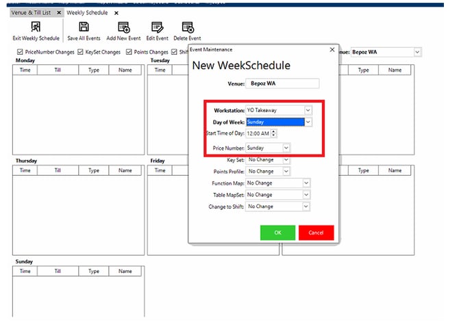 Setup: Login to BackOffice, go to Operational Setup>Weekly Schedule